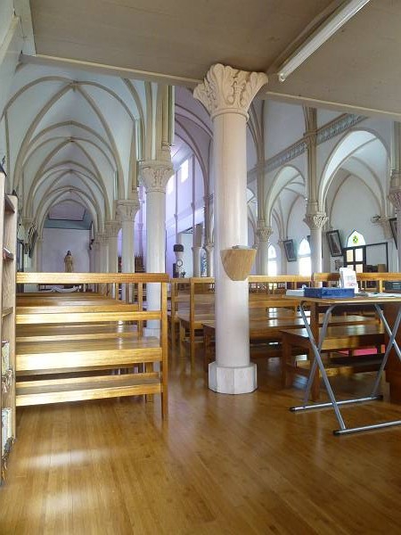 この写真は少しだけ開いていた扉の隙間から撮らせていただきました。 こうもり天井(リブ・ヴォールト天井)が美しいですね。楠原教会は、福江港から車で岐宿方向へ行き(約20分)、岐宿支所の信号を左折(二本楠方面)約10分です。