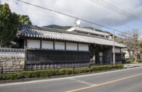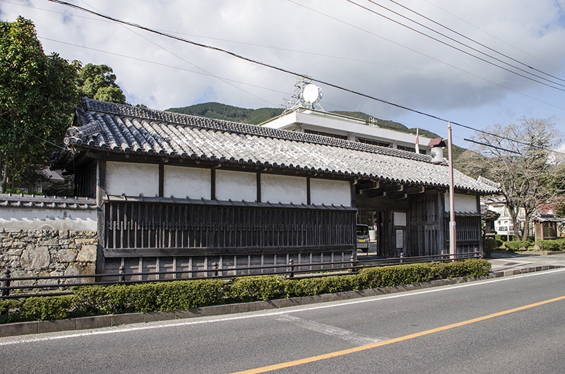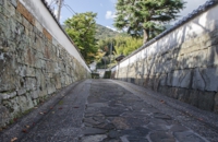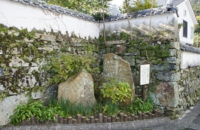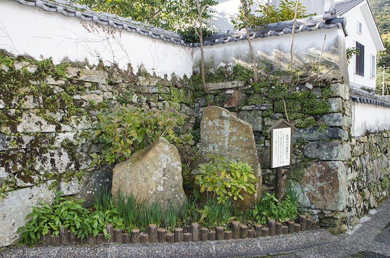 広大な敷地を囲む石垣塀沿いに進むと、北東の一角が張り出して、衝立状の大小の石が置かれています。説明看板によると「陰陽石の魔除け石」とあり、さらに外敵や賊から守るため武者が隠れていたことから「武者隠し」とも言われるとあります。
