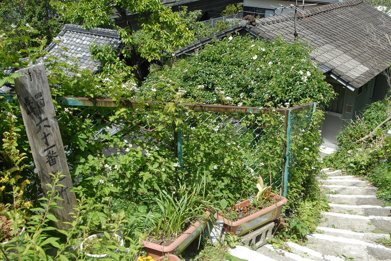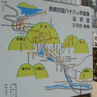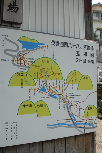 歩くこと数秒で、車道側の道と上り坂と、ふたまたに分かれた通りに出ます。子安大師堂へは、どちらからも行けますが、私は上り坂をチョイス。すると、右手に周辺地図がありました。イラストが入っているので、わかりやすいなぁ。長崎人の私ですが、山の名前はうろ覚え。そっか、彦山ってこっちなんだ。