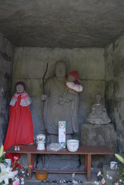 お堂横にはお地蔵さまがいらっしゃいました。あ、赤ちゃんを抱いている❤ せっかく来てナンですが、残念ながら子持たずな上に、産む予定もナシ。なので、世の中の妊娠中の方々の安産を祈願しました。