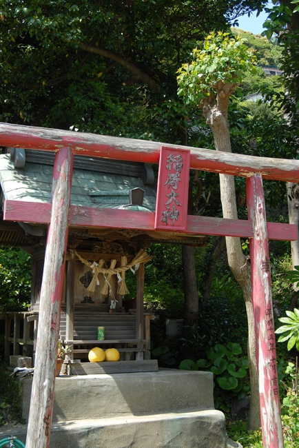 鳥居をくぐり抜け、境内を進むと赤い鳥居が。「稲荷大神」と書いてあります。お供え物がザボンというところにグッときました。ザボンは、長崎発祥の果物ですものね。
