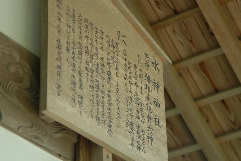 拝殿には、水神神社の歴史を記した案内板があります。それにしても達筆。