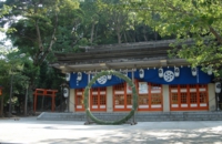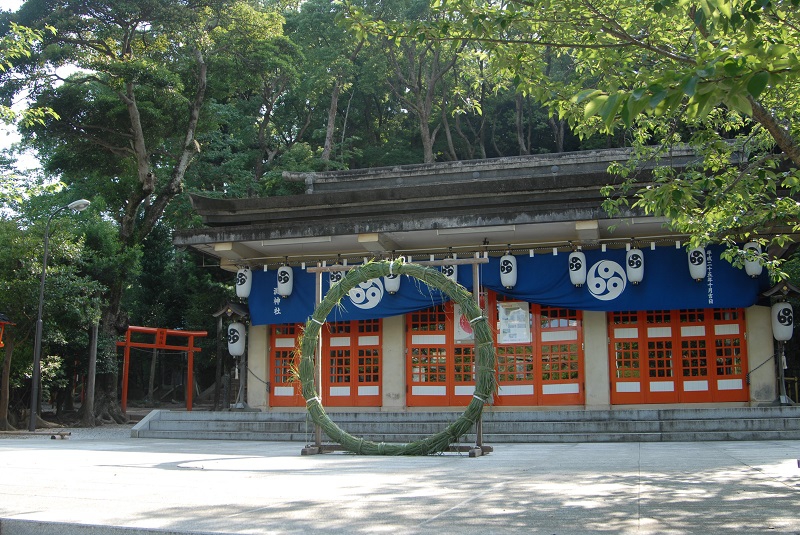 周囲の木々に、朱色の拝殿が映えてキレイ。撮影時が夏越祭り前だったので、参拝客をくぐらせて、祓い清める茅の輪(ちのわ)が用意されていました。