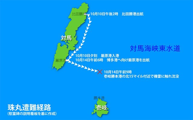 順調に航海していた珠丸ですが、午前9時に壱岐、勝本港の北方15マイル付近で、旧日本軍が敷設した機雷に触れ爆沈。乗船名簿には乗員、乗客730名となっていましたが、実際には切符を購入せずに乗船したため名簿に記載がない乗客が数多く、1000名以上乗っていたとみられています。
