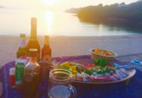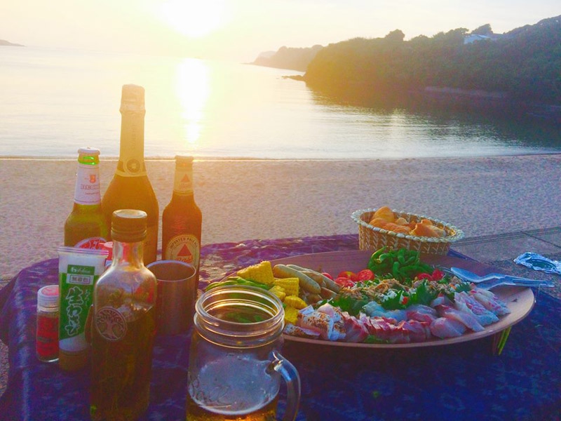 私たちも夕日が落ちる前に買い出しとテント設営を終わらせ、テーブルセッティング!魚は釣ってきた鯛やアコウやイサキ。あとはちょっとしたおツマミにお酒!