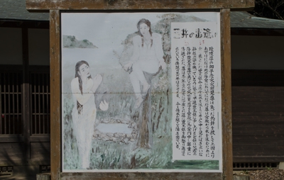 説明看板によると瓊瓊尊(ににぎのみこと)の御子、彦火火出見尊(ひこほほでみのみこと=山幸彦)は、失った釣針を求めてこの海宮にたどり着き、井戸の横の木に登っていたところ、水を汲みに来ていた侍女に見つかり、海神の豊玉彦とその娘、豊玉姫に厚いもてなしを受け、当地で3年を過ごし豊玉姫を娶(めと)った。とあります。不思議なことにこの井戸、浜辺の近くにありながら現在でも清水が湧き出ているようです。