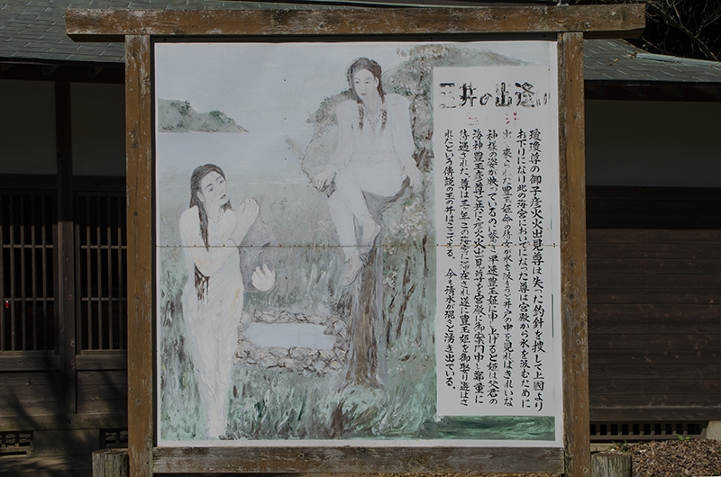 物語はさらにこの先があり、山幸彦は海神豊玉彦から失った釣針と潮満瓊(しおみつたま)・塩涸瓊(しおふるたま)の宝珠をもらって帰途につき、この2つの珠を使って兄の海幸彦を服従させます。井戸の前の浜は満珠瀬(まんじゅせ)、干珠瀬(かんじゅせ)と名付けられ、この物語の故事を伝えています。