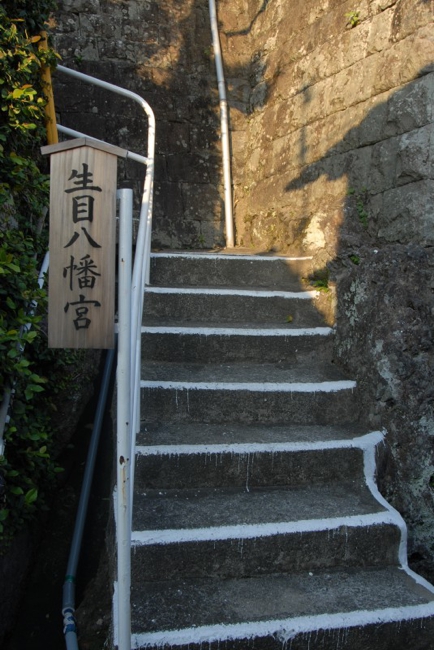 最短ルートは恐らくこちらの細道&石段が続く天神二丁目。二丁目から行くと、徒歩1、2分で生目八幡宮の案内看板にたどり着けます。