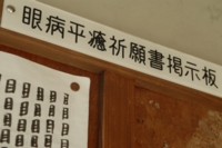 祠の中には「目」と書かれた用紙を貼る眼病平癒祈願書掲示板があります。参拝者は、やはり地元・長崎人が多かったです。なんでわかったかというと、目と書かれた用紙の終わりに、住所と名前を書き添えた方がいたから。