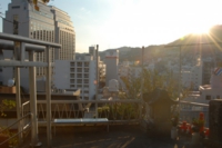 最初に「なかなかの絶景」と書きましたが、生目八幡宮から望む景色がこちら。日差しを浴びているのが稲佐山、左側がベストウエスタンプレミアホテル長崎です。宝町エリアの街並みが眼下に広がります。遠くの緑を見るのは、目にも良いと言うし。祈願して稲佐山を見る……1ヵ所で2度楽しめるスポットでもあります。