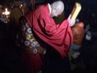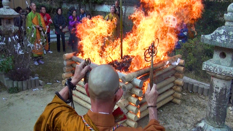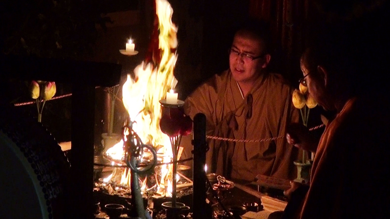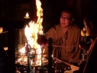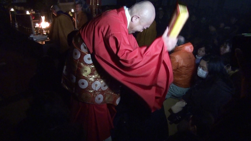 閉め切って真っ暗な本堂内では、僧侶達による読経にあわせ参拝客の願いが込められた護摩木がひとつひとつ燃やされていきます。立ち上る炎と煙で護摩壇の周りの僧侶達の顔が赤く火照り、お経を上げるのも苦しそうでした。