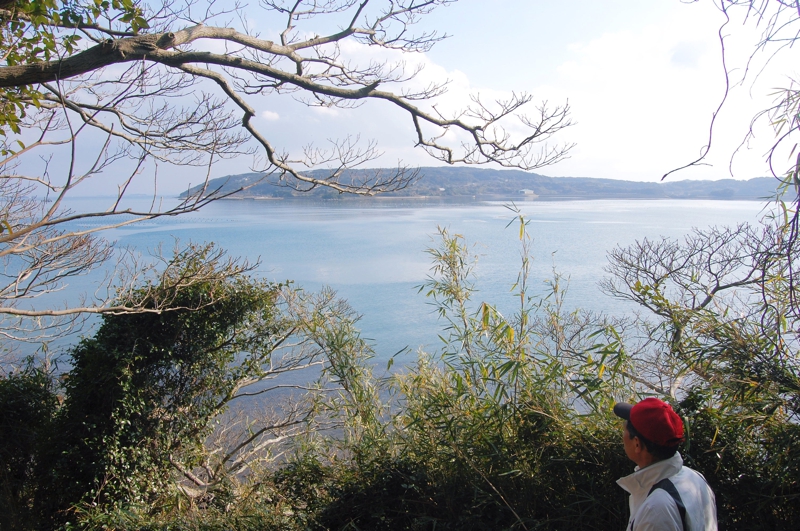 境内からは島の東部、石田町山崎方面が見えます。この内海湾は、弥生時代に一支国と大陸を行き交う古代船が停泊し、小舟に乗り換えて人や物を王都「原の辻」へ運んだところです。