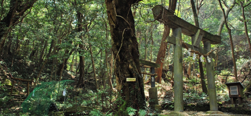 竜良山原始林は天道信仰の聖地として古より、斧を入れることが禁じられ、自然そのままの照葉樹林が残っています。国の天然記念物で、国有林として守られている為、2週間前に入山申請が必要とされるなど、厳しく管理されている場所です。今回のパワースポットは、届出がいらない竜良山登山口の側にある天道大神神社を紹介いたします。