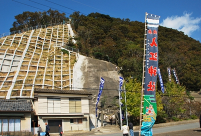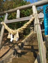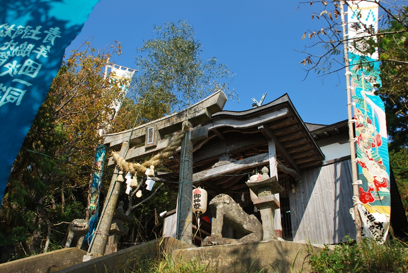 今回ドライブの途中、幟(のぼり)が立っているのを見つけた場所は対馬の中央部、浅茅湾に面した豊玉町の水崎地区。神社の入口から見上げると、ジグザグに登る道が山頂まで続いていて、参拝するにはかなりきつそう・・・