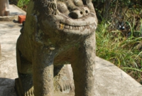 頂上からの景色は丁度、逆光で海面がキラキラ光り、浅茅湾を挟んで遠くに美津島町の山並みがシルエットで見え、とてもきれい。きつい思いをして登ってきた甲斐がありました。そしてここの神社の狛犬・・・そのユニークな表情に思わず大爆笑して疲れも吹き飛びました。