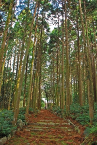 そのような古い歴史を持つ銀山上神社(ぎんざんじょうじんじゃ)、さっそく古い鳥居をくぐり、拝殿へ続く参道を歩くと両側に木々やシダが茂り、昼間でも薄暗く感じられます。