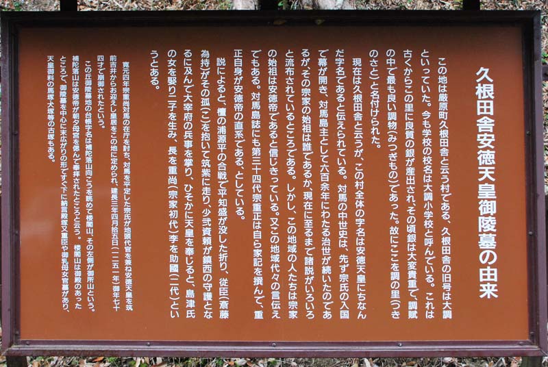 安徳天皇は、壇の浦源平の合戦で敗れ、祖母である二位尼に抱かれて急流に入水し、わずか八歳で崩御したとなっていますが、この久根地区では、安徳天皇は対馬に逃れて生き延び、対馬島主、宗氏の始祖であると信じられ、その墓も宮内庁の陵墓参考地として残っているため、銀山上神社に祀られています。