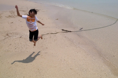 浜辺に立ってみると、なにか書いてました。娘が読みあげます。「ゆうこを、愛してますがなにか?」。。。だそうです。「どういうこと?」と娘が聞いてきます。「だれかが、ゆうこさんを愛してる。そして、そのことを、だれにも邪魔されたくない。ということを、世の中の人にアピールしたかったみたい」と説明してみました。・・・・まあ、とにかく、愛を叫びたくなるほど、いいビーチなのです。「せっかく香珠子のことを紹介するのなら、自分で紹介文を書いてみてよ」と娘に言ってみたのですが、書きたくない!書きたくない!とものすごい拒否反応です。イヤイヤ書かせてもおもしろくないし、、、と思い、「じゃあ、この海の良さをポーズで表現してみて!」と頼んでみました。