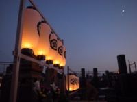 五島では、お盆になると夜お墓に家族が集まります。墓石の周りを木の枠で囲い、そこに提灯をつるして灯りをともします。どこの墓も同じです。