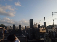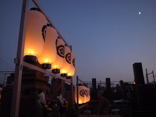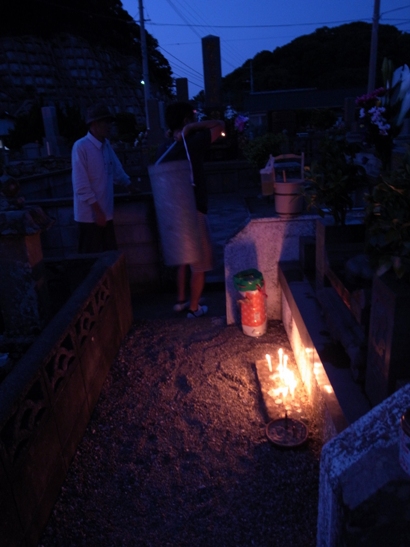 お盆の3日間、夕暮れになるとそれぞれのお墓に、それぞれの家族が集まり、提灯をともす。線香を立ててご先祖様に手を合わせます。そして、親類のお墓や、親しかった人のお墓にも線香をたててまわります。そこで、しばらく会っていなかった親類の人たちと近況を報告しあったりします。子どもたちは、お墓の敷地内で花火をします。爆竹も鳴り響くので、お墓中、けっこうにぎやかです。